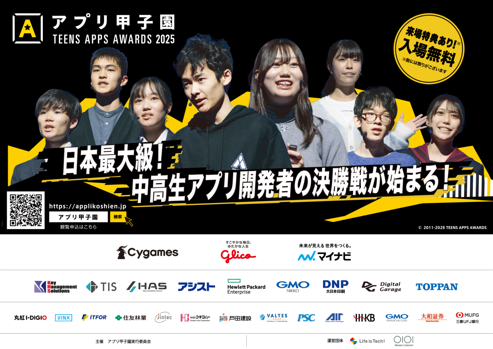 アプリ甲子園実行委員会は、全国の中高生を対象にしたスマートフォン向けアプリ開発コンテスト「アプリ甲子園」の決勝大会を、2025年11月16日(日)にTODAホール&カンファレンス東京にて開催いたします。決勝大会では「一般開発部門」と「AI開発部門」で選出された12組の中高生が一堂に会して、公開プレゼンテーションを行います。