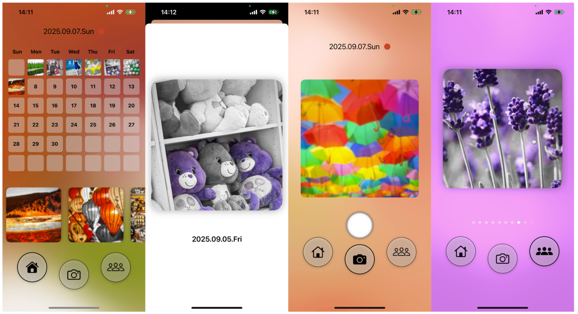 日常の風景を特別な写真として記録し、自分だけのカレンダーを作れるアプリです。写真の中の特定の色だけが鮮やかになり、他の色はモノクロになる機能を通じて、自分だけのカレンダーをつくることができます。色を探しに行くことでいつもの景色を見る目が変わり、一つの思い出として記録することができます。