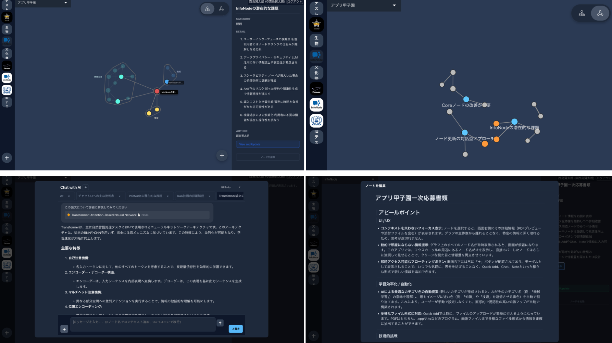 Graph×LLMを中核に、対話で選んだノードやカテゴリを文脈としてAIに渡し、知識を芋蔓式に辿れる知識発見・共有ツールです。ノートやチャット、資料を自動で関連付けて可視化し、ユーザーとAIが同じ情報空間を参照しながら思考・創造を進められます。知識が自律的に循環・成長し、研究・開発・学習を加速します。
