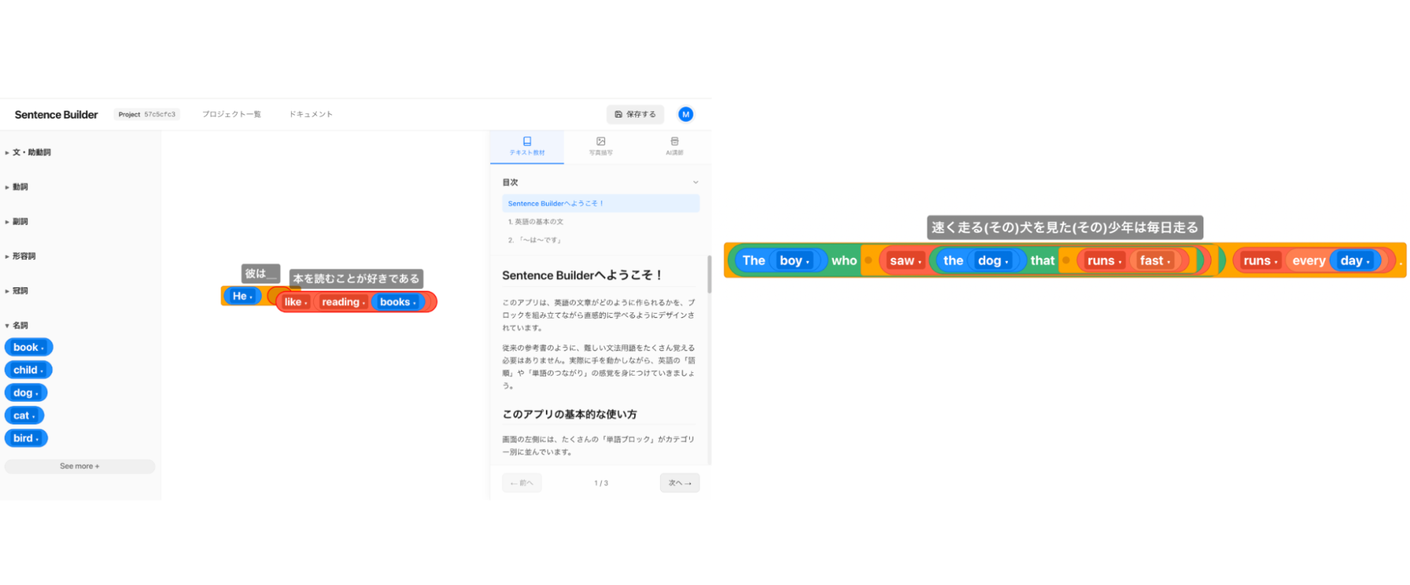 英単語ブロックをドラッグ&ドロップで組み立てることで、英文法を直感的に学べる学習アプリです。SVOといった文法ルールを知識としてだけでなく、体験を通して身につけることができます。これから英文法を学ぶ小中学生から、復習したい社会人まで、個人の学習や学校の教材として幅広く活用できます。