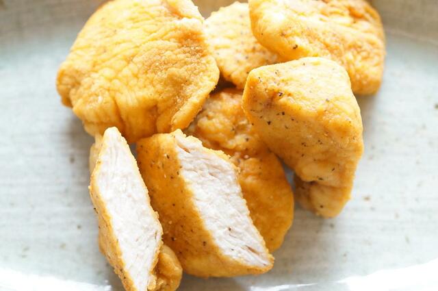 パサつきがちな鶏ムネ肉でもおいしくできるかな? と試してみると、チキンナゲットのような食感でおいしく仕上がりました。揚げてないので罪悪感も少ないし、ダイエットメニューにもよさそう!