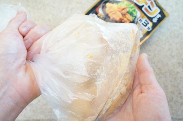 1. 調理用ポリ袋に一口大(30g程度)にカットした鶏肉と「レンジでチンするから揚げ粉」をパッケージに記載の分量どおりに加える。
