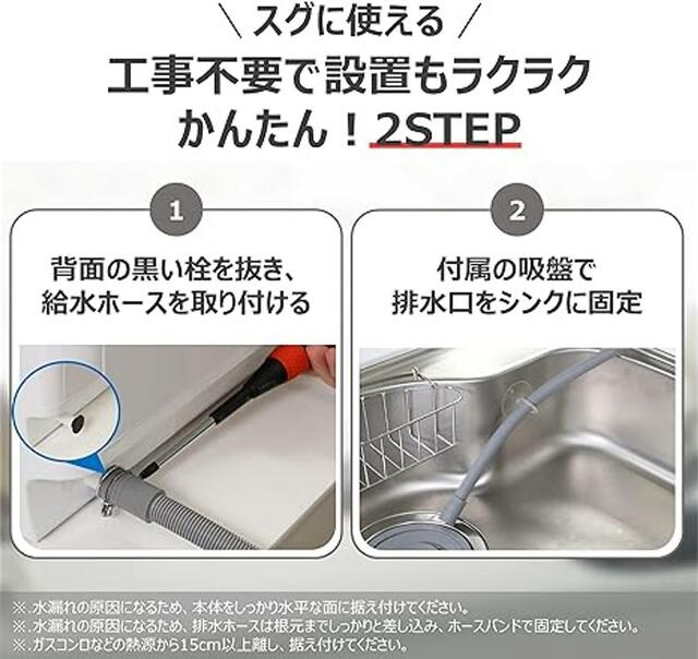 アパートや賃貸住宅などでも設置しやすく、届いたその日から使える手軽さが魅力。省スペース設計でキッチンカウンターや冷蔵庫横にもすっきり収まります。排水はシンクやバケツにも対応しており、レイアウト自由度も抜群です。