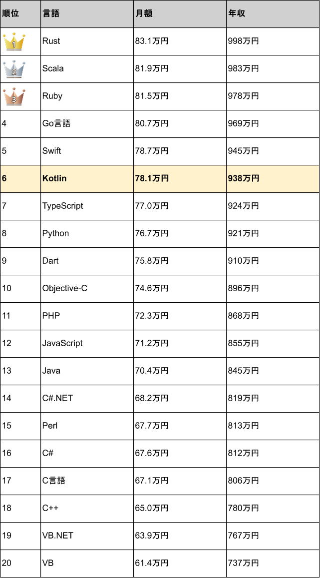 Kotlin案件の平均月額単価は78.1万円、平均年収は938万円で、プログラミング言語別の年収ランキングでは6位に位置しています。