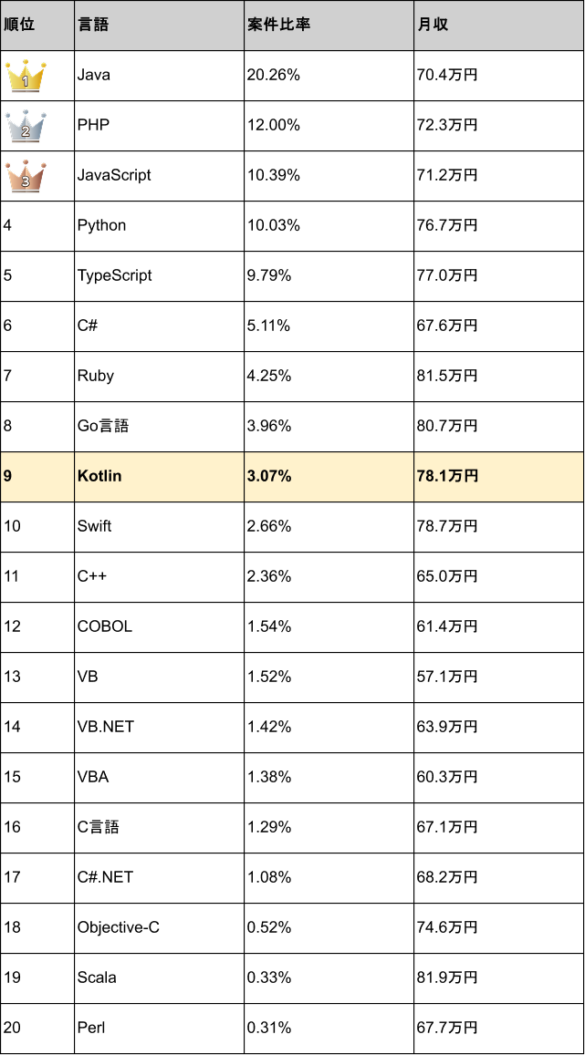 Kotlinスキルは現在のIT市場で安定した需要があります。平均年収は938万円で言語別ランキング9位、平均月額単価は78.1万円、案件比率は3.07%です。