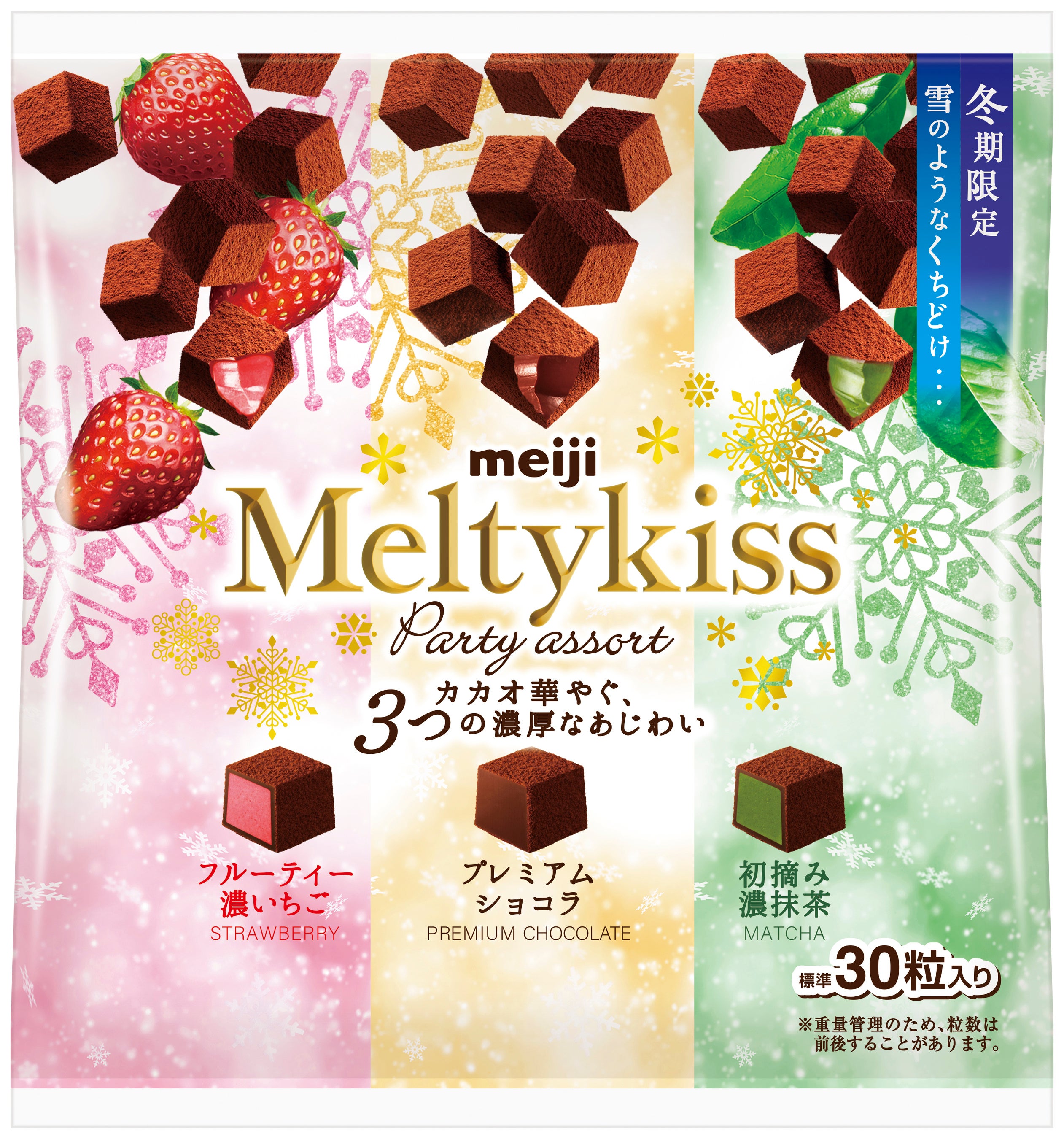 「メルティーキッスパーティーアソー ト 袋」フルーティー濃いちご、プレミアムショコラ、初摘み濃抹茶の3種類がたっぷり標準30粒入ったアソート袋です。雪のようなくちどけを3種類の味わいで楽しめます。