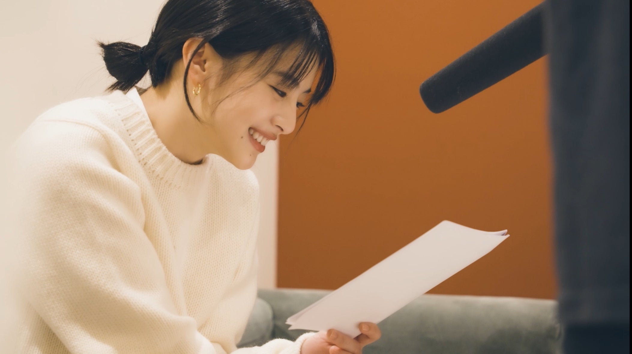 今年のCMで描かれるのはある冬の日の「待ち合わせ」。雪が舞う時計台の下、友だちを待つ出口さん。 最初のシーンでは白いコートに白いニット、ふわふわの白いマフラーという全身ホワイトコーデで登場し、その透明感あふ れる姿は雪景色にしっくりと溶け込みます。なかなか来ない友だちに待ちくたびれて、マフラーに顔をうずめる仕草に、心 細そうな表情を浮かべる様子や、時計台の下で寒そうにしゃがみ込む姿も愛らしく、冬の待ち合わせの情景がリアルに描かれます。