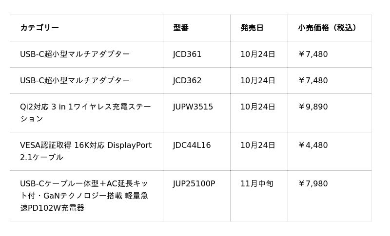 グローバルなコンピューターおよびモバイル周辺機器ブランドのj5createは、『USB-C超小型マルチアダプター JCD361 / JCD362 』、『Qi2対応 3 in 1ワイヤレス充電ステーション JUPW3515』、『VESA認証取得 16K対応 DisplayPort 2.1ケーブル JDC44L16』の4製品を2025年10月24日に発売いたします。