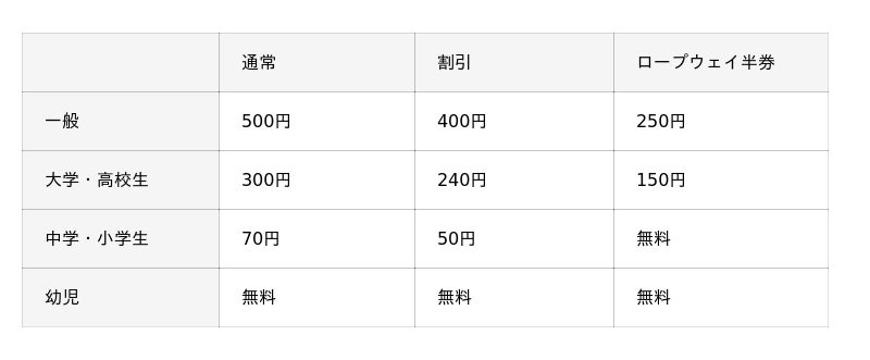 - 身体障害者手帳、療育手帳、精神障害者保健福祉手帳の交付を受けた方、及び介護者1名、どんぐりカード、ひょうごっ子ココロンカード提示の小中学生、姫路市内在住の65歳以上の方は無料