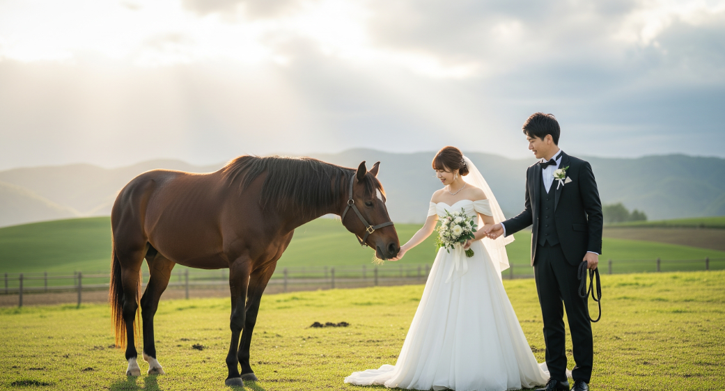 本サービスの最大の特長は、元競走馬との共生体験を通じて“命とともにある誓い”を表現できる点にあります。 引退後も穏やかに暮らす馬たちと過ごす時間は、結婚という節目をより深く、意味のあるものに変えてくれます。撮影・編集では、事前ヒアリングをもとにふたりの物語を“作る”のではなく“引き出す”手法を採用。自然体の表情や仕草をありのままに記録し、音楽・光・風景を織り交ぜながら一本の映像作品として仕上げます。