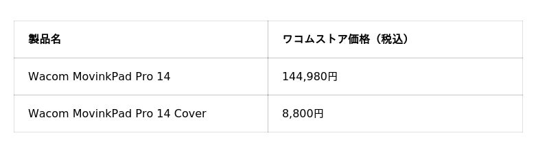「Wacom MovinkPad Pro 14」は、【公式】ワコムストア(https://estore.wacom.jp/ja-JP)および楽天市場店、Yahoo!店などの直営店のほか一部量販店でご購入いただけます。予約受付は10月24日(金)より開始し、10月31日(金)に発売します。同日発売のオプション品「Wacom MovinkPad Pro 14 Cover」もご用意しています。「Wacom MovinkPad Pro 14」と「Wacom MovinkPad Pro 14 Cover」の販売価格は以下の通りです。