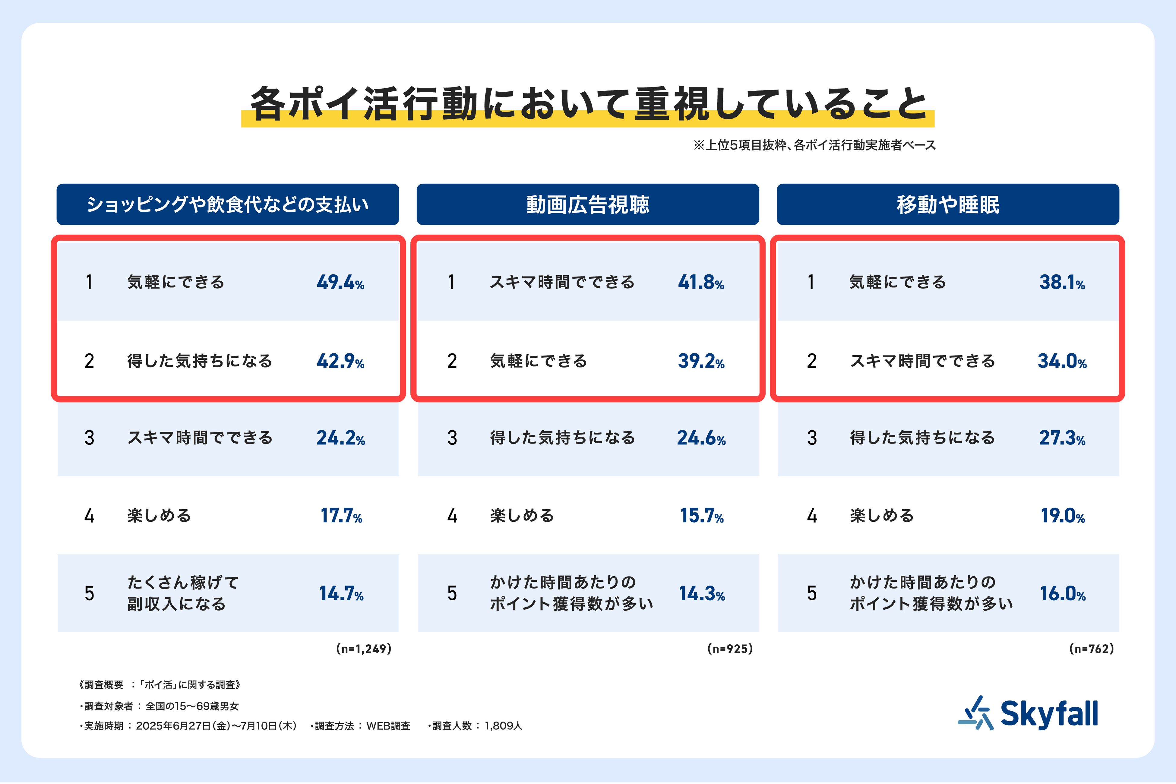 ポイ活で求められるのは「気軽さ」と「即時性」でスキマ時間の活用が重視されていることが明らかに。ポイ活で人気な行動は「ショッピング」「動画視聴」「移動や睡眠」が上位