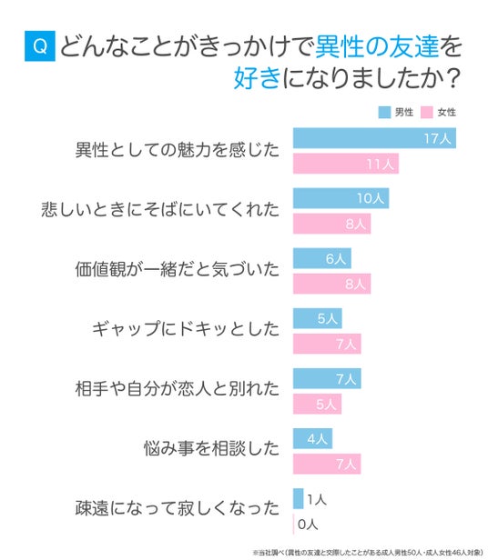 続いて、異性の友達と交際経験のある成人男女96人に、好きになったきっかけを聞いてみました。