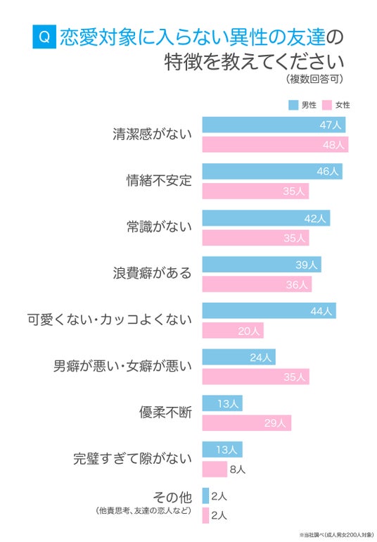 成人男女200人に、恋愛対象に入らない異性の友達の特徴を聞いたところ、「清潔感がない」と「情緒不安定」が上位にランクインしました。