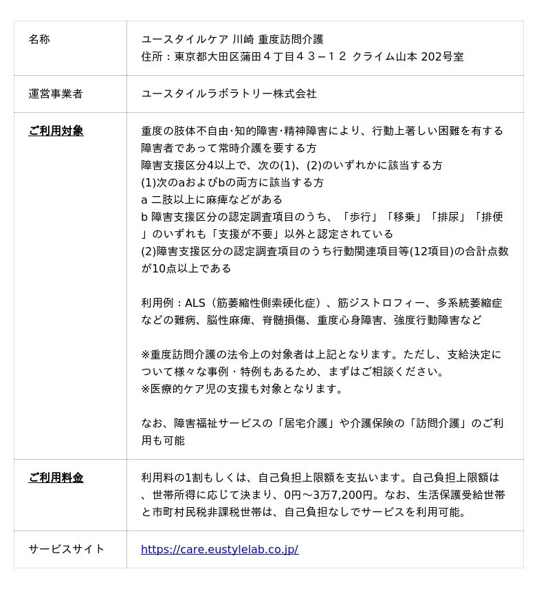 「すべての必要な人に、必要なケアを届ける。」をミッションに、重い障害や難病のある方に重度訪問介護事業を中心とした包括的介護福祉サービスを全国に届けるユースタイルラボラトリー株式会社(本社:東京都中野区、代表取締役:大畑健)は、2025年10月1日、当社として神奈川エリア4拠点目となる重度訪問介護サービス事業所「ユースタイルケア 川崎 重度訪問介護」事業所を開設しました。