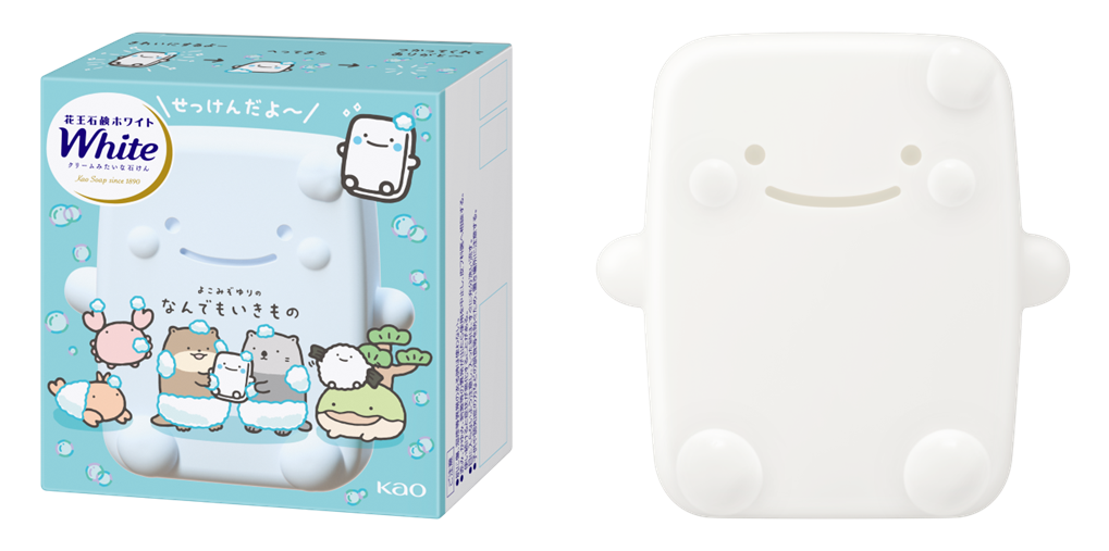 なんでもいきもののキャラクター“せっけん”の、実際に使えるせっけんを販売します。また、「花王石鹸ホワイト」を含むなんでもいきものオリジナルグッズを2,200円(税込)以上お買い上げの方、先着200名様にせっけんケースをプレゼントします。