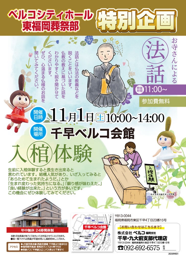 株式会社ベルコ(本社:大阪府池田市、代表取締役社長:齋藤 斎)は、地域の皆さまに仏教文化への理解と“いのち”について考える機会を提供するため、**ベルコシティホール東福岡葬祭部(千早ベルコ会館)**にて特別企画を開催いたします。