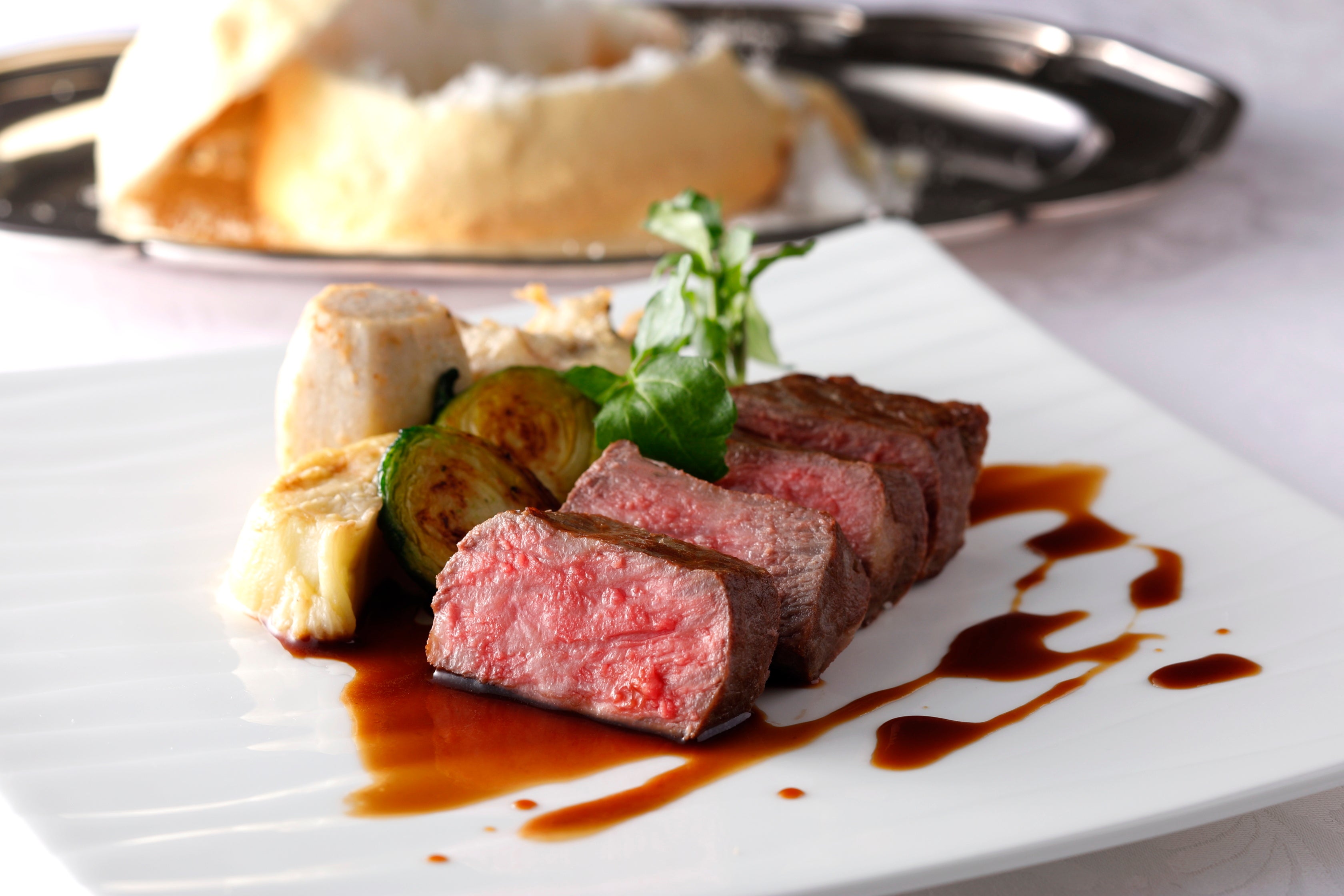 ◆福井県産“若狭牛”サーロインの塩釜焼と“九頭竜まいたけ”のフリット “米五味噌”のソース