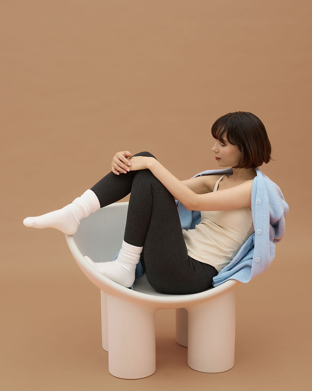 縦ラインのリブ編みが脚をスラッと見せ、優しい印象を演出。