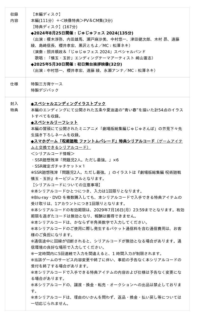 スペシャルエンディングイラストブックでは、本編のエンディングにて公開された五条や夏油達の“青い春”を描いた計54点のイラストすべてを掲載。さらに特典DVDには、初日舞台挨拶映像や「じゅじゅフェス 2024」の映像を特別に収録!また、本編の冒頭にて公開されたミニアニメ「劇場版総集編じゅじゅさんぽ」の芥見下々先生描き下ろしネームを収録したスペシャルリーフレットや、スマートフォンゲーム「呪術廻戦 ファントムパレード」の特典シリアルコードなど貴重な特典満載でお届けします!