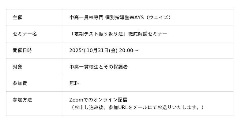 中高一貫校専門の個別指導塾WAYS(運営:株式会社メイツ、本社:東京都新宿区)は、中高一貫校に通う生徒と保護者を対象とした無料オンラインセミナー『定期テスト振り返り法 徹底解説セミナー』を2025年10月31日(金)20:00より開催します。