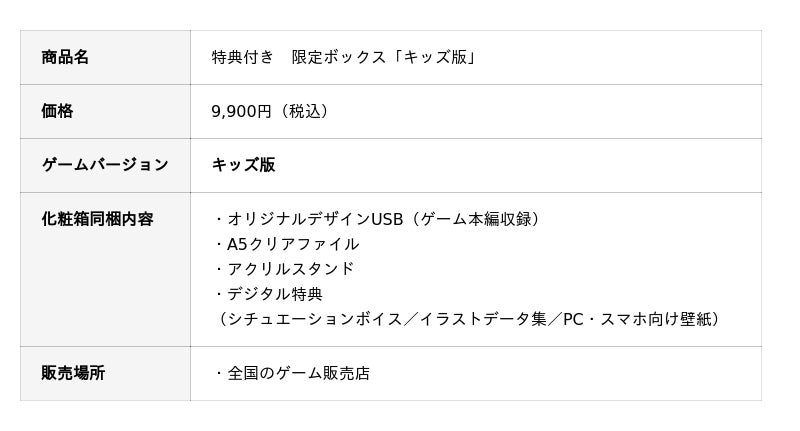 限定ボックス「キッズ版」は、ゲーム本編のセンシティブなシーンを隠し、より広い年齢層に楽しんでいただける内容に調整したものです。