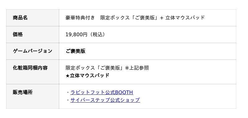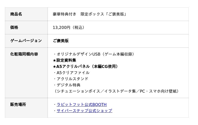 2025年10月28日(火)より『ちなみほりっく -Chinami Holic-』の限定ボックス(ご褒美版)を「ラビットフット公式BOOTH」と「サイバーステップ公式ショップ」の両公式ショップでの予約受付を開始します。公式ショップで取り扱う本作は、センシティブなシーンを包み隠さず楽しめる「ご褒美版」となっています。「ご褒美版」は、公式サイトでのみの取り扱いとなります!