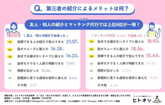 この設問では、以下1.2.の方を対象に、第三者の紹介によるメリットを尋ねました。1.希望条件とは異なる方とマッチング代行で出会い、交際・結婚に発展した方