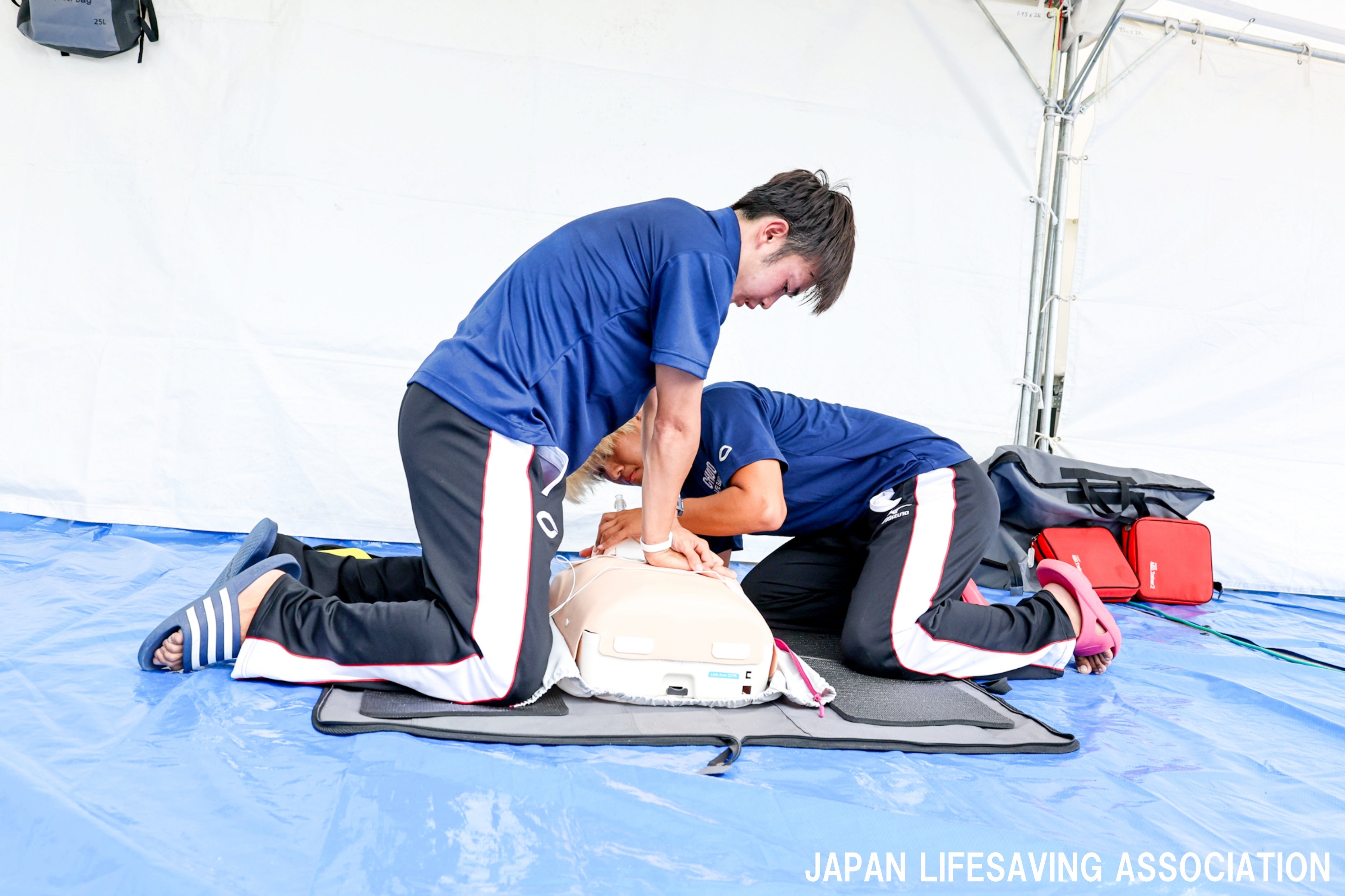 今大会もBLSアセスメントが実施されました。各チーム(男女別)の出場登録されている選手から抽選により2名選出され、大会1日目にBLSアセスメントを行いました。2日目に結果が掲示され、評価員からフィードバックを行い、評価について説明しました。