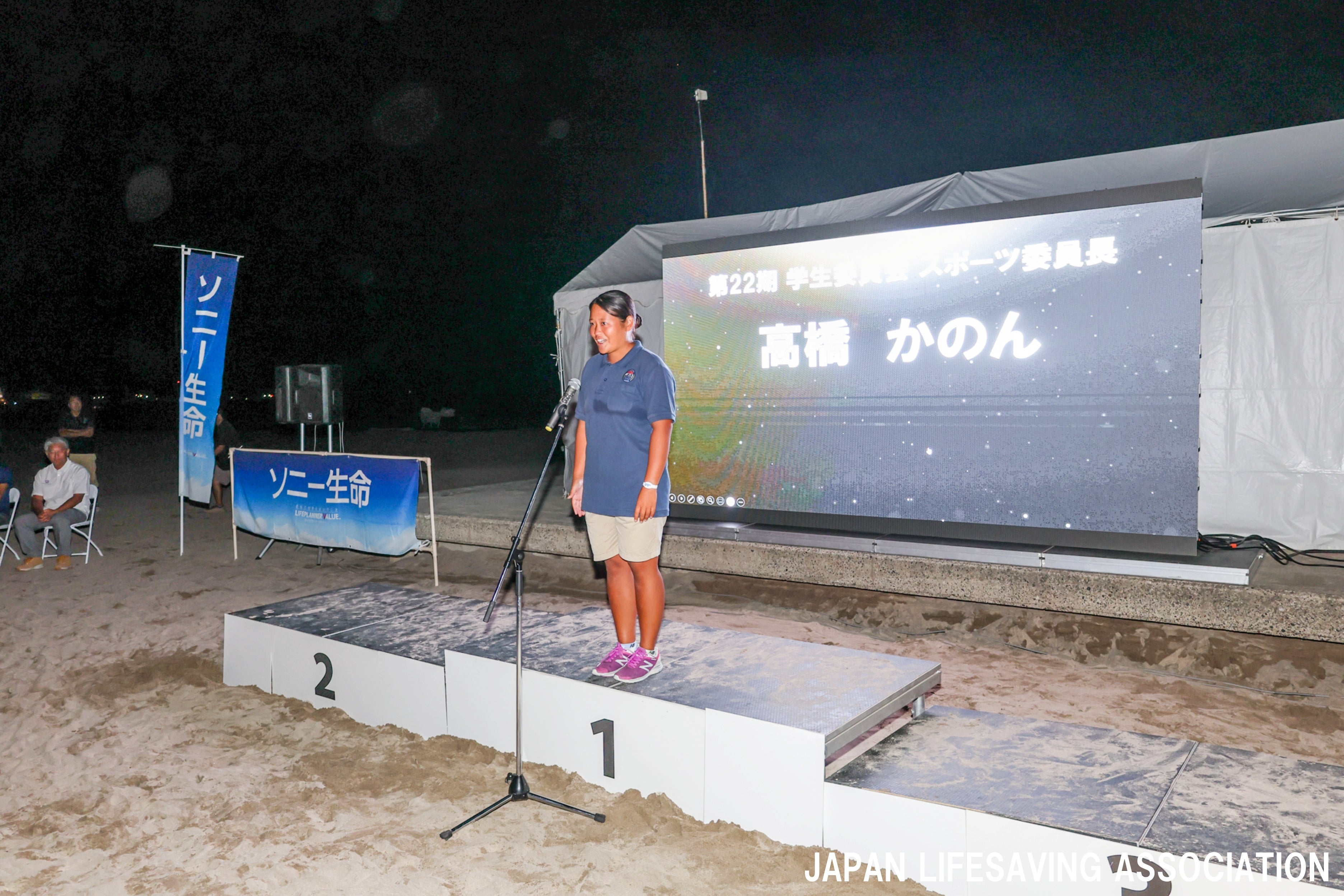 また、今大会は学生選手権であり、開会式では第22期学生委員会の委員長、徳嶺仁美(日本体育大学ライフセービング部)、閉会式ではスポーツ委員長、高橋かのん(日本体育大学ライフセービング部)が挨拶を行いました。
