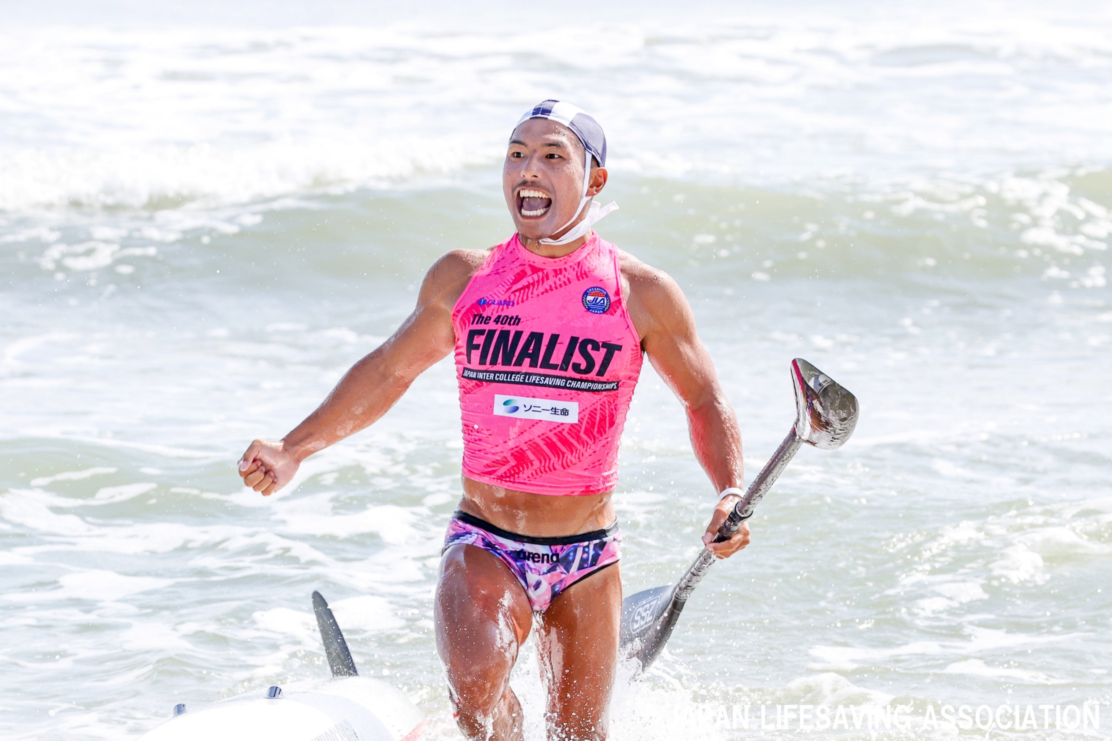 今大会3冠を果たし、大活躍した明治大学サーフライフセービングクラブの太田諒選手。