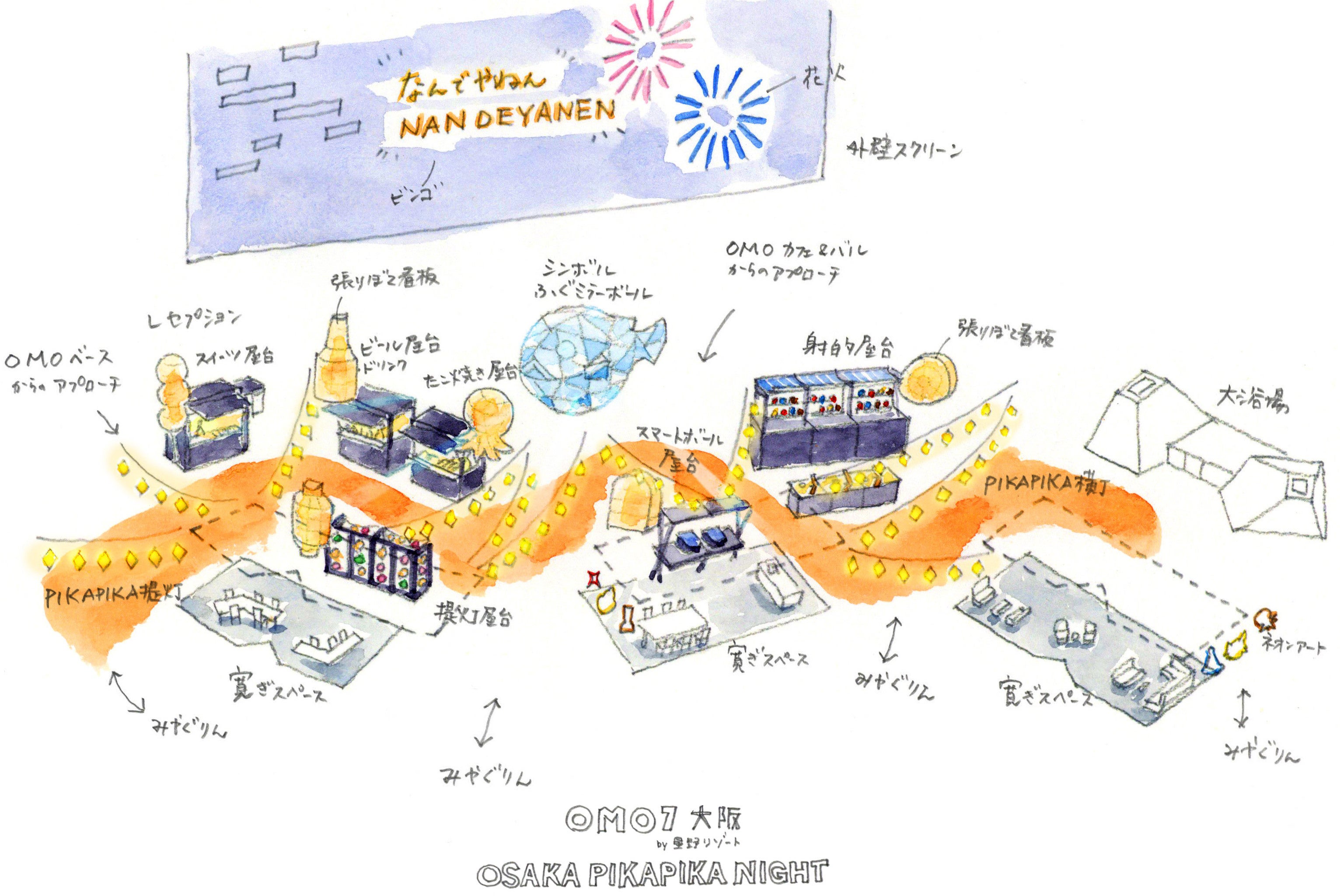は、2025年11月4日より、「OSAKA PIKAPIKA NIGHT」を実施します。このイベントは、これまでに実施していた「PIKAPIKA NIGHT」が大リニューアルしたもので、大阪の街の活気を表現した「PIKAPIKA横丁」がガーデンエリアみやぐりんに誕生し、限定のなにわグルメや遊びを満喫できます。また、メインイベントとなる「コテコテSHOW TIME」では、吉本興業の芸人によるお笑いライブや、ホテルの壁面の演出照明を使用したBINGOを宿泊者全員で楽しめます。大阪の活気や食、エンタメなど、日中の観光で得た高揚感をそのままに、寝る直前まで大阪を大満喫できるイベントです。本取り組みは、全国のOMOで展開している夜のイベント「ローカルリズムナイト」の一環として実施しています。