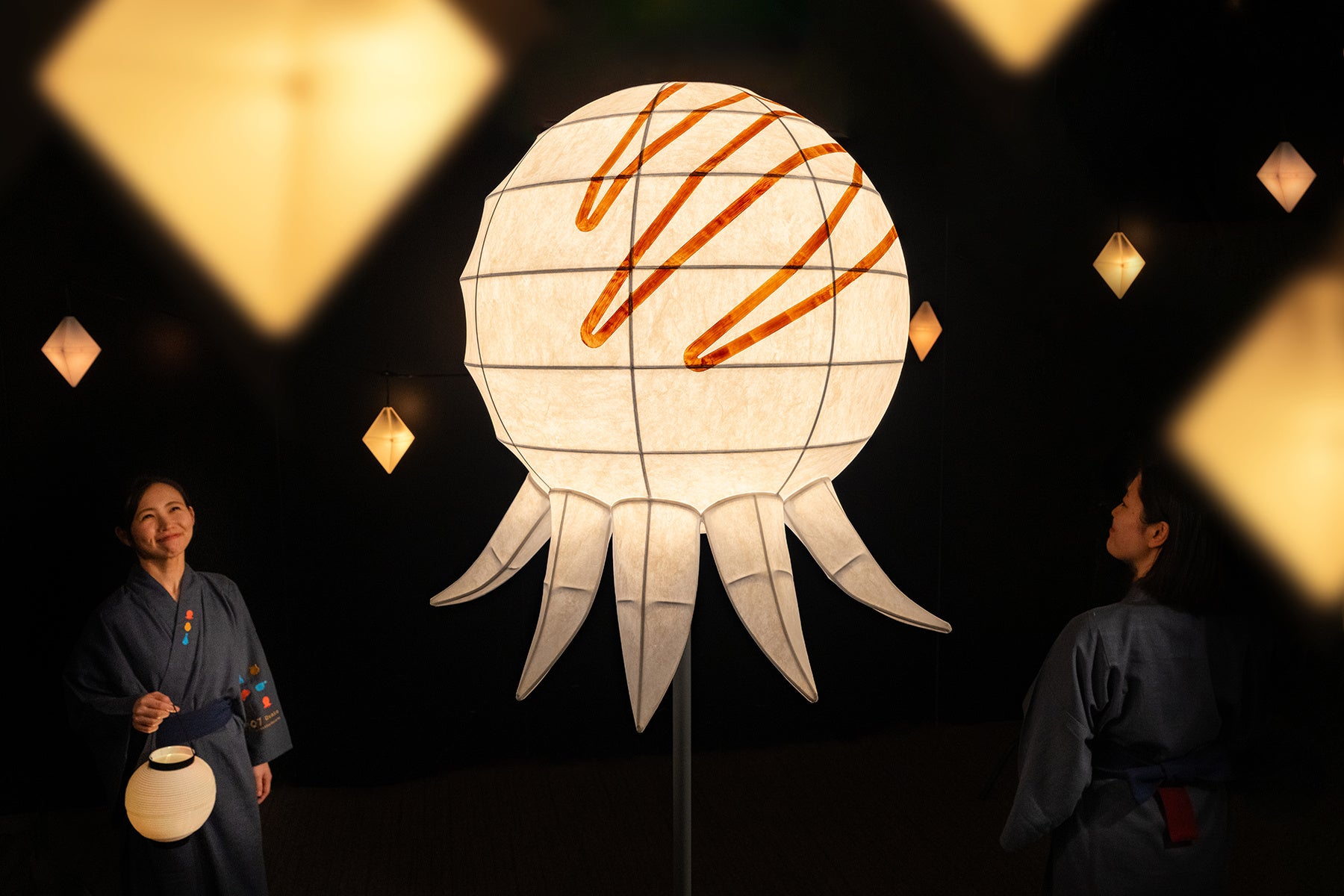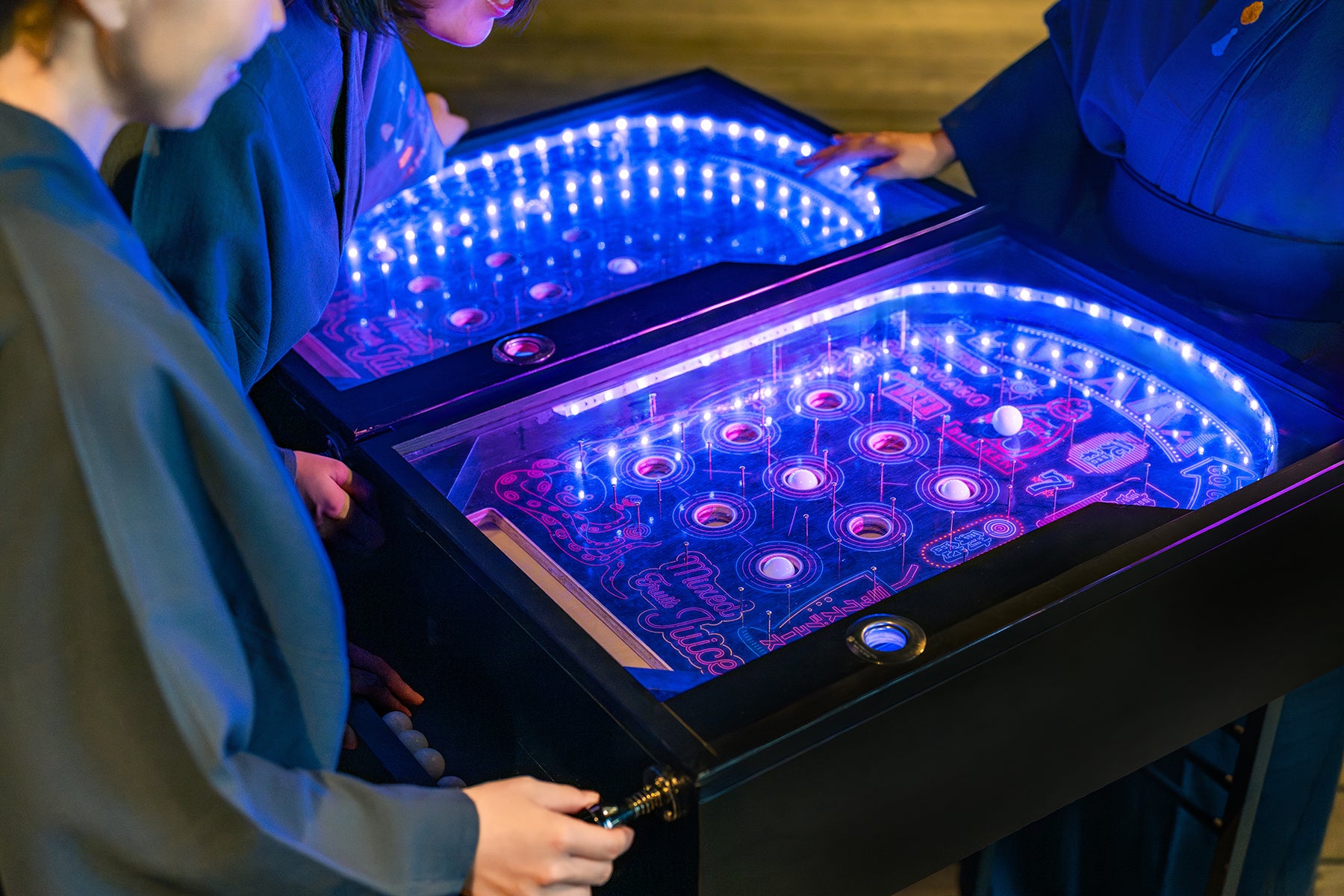 娯楽の街としても知られる新世界で、長く親しまれてきた遊び「射的」と「スマートボール」がPIKAPIKA横丁に登場します。射的は、大阪にちなんだタコやふぐなどのシルエットが的に、スマートボールは、大阪の街のネオンサインをイメージしたデザインの板面になっており、随所に大阪らしい遊び心を感じられます。景品として、大阪うまれの駄菓子を用意しており、大人も思わず童心に帰ってしまうような、熱中した時間を過ごせます。また、横丁気分を味わうアイテムの一つとして提灯を用意。柔らかな灯りが横丁に溶け込み、滞在着の浴衣を着用して提灯を持ち歩くことで、さらに気分を盛り上げます。