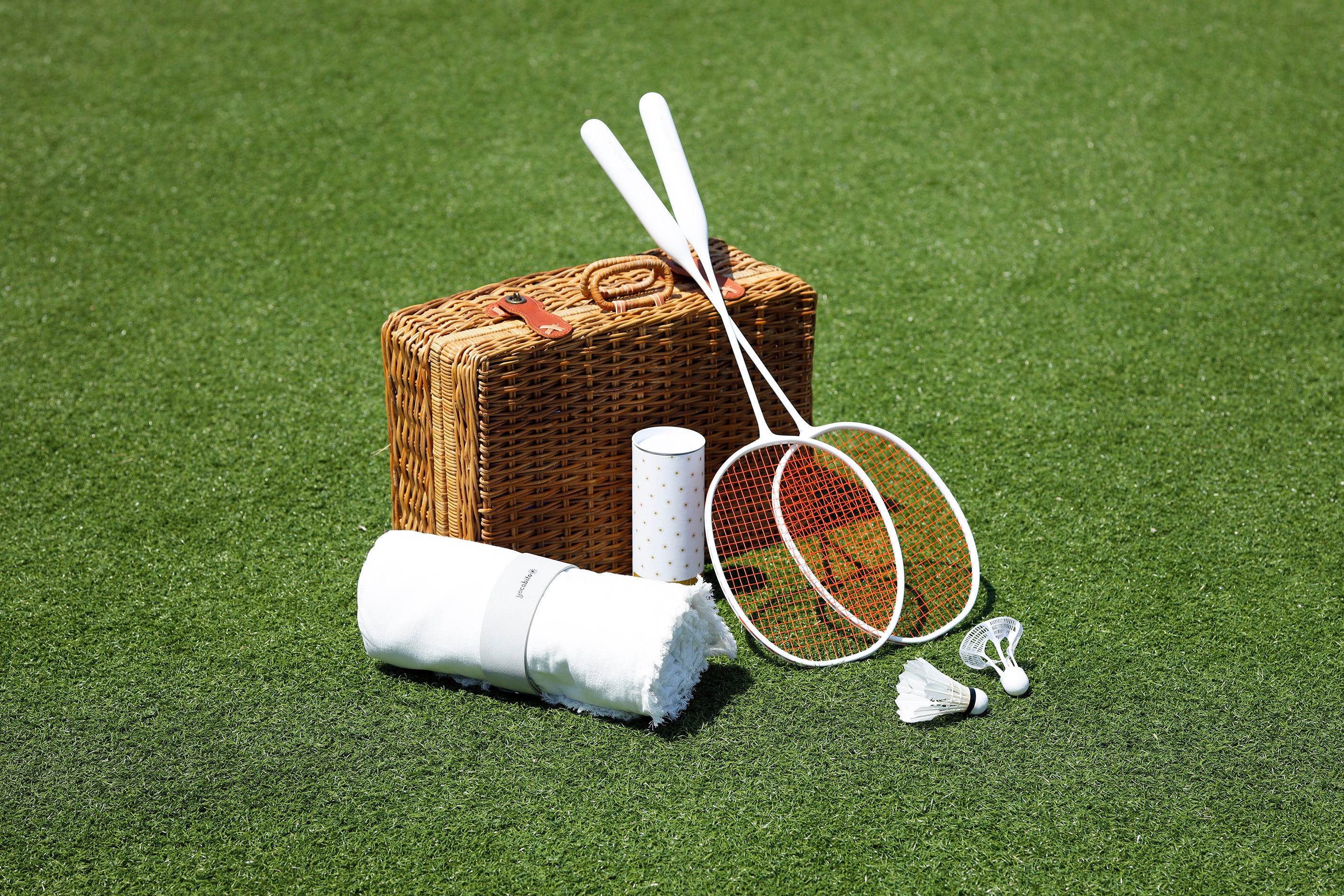 デザイナーズ・バドミントン「VALENCIA」と、コットンリネンのピクニックシート「HEIDI」がセットに。 気分が高まる、おしゃれピクニック体験を提案