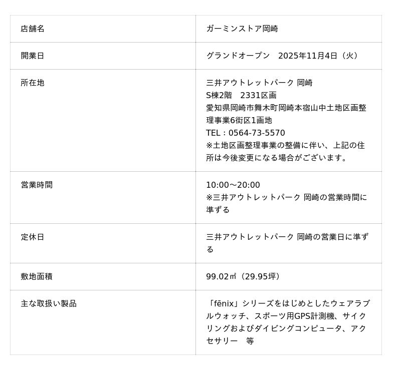 アメリカ発データ活用のプロフェッショナル、ガーミンジャパン株式会社(以下、Garmin)は、2025年11月4日(火)にグランドオープンする「三井アウトレットパーク岡崎」に、ブランド直営店「ガーミンストア岡崎」(愛知県岡崎市舞木町)を出店します。