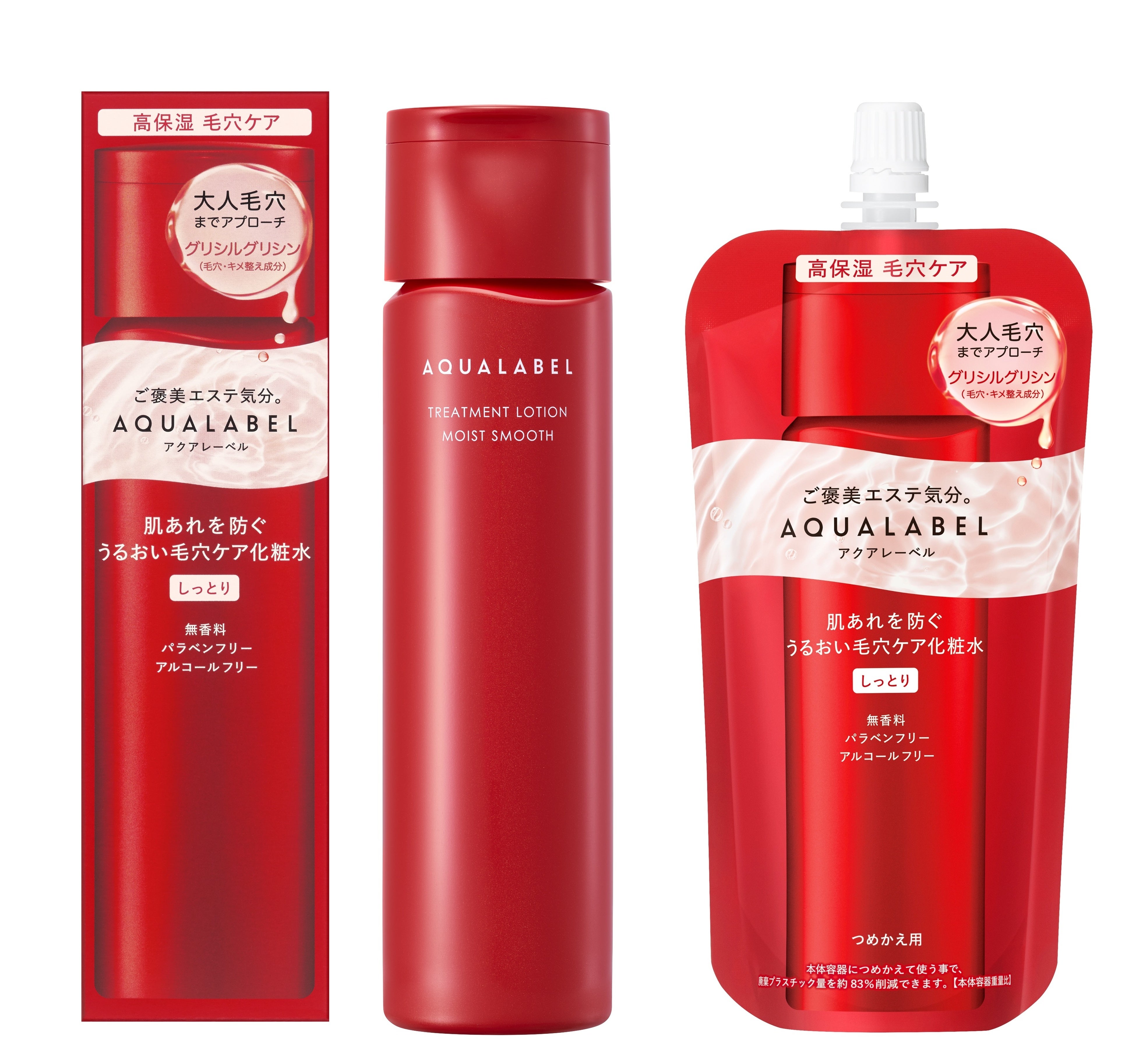 トリートメントローション (モイストスムース)は、毛穴・キメ整え成分「グリシルグリシン」を配合。さらに、肌あれ防止有効成分「グリチルリチン酸ジカリウム」、「m-トラネキサム酸」で、肌あれを防ぎながら毛穴ケアまで対応した処方です。また、資生堂独自の分析技術から発見された希少な「D-アミノ酸」からなる「浸透美容アミノ酸※3」も配合。美容液級の化粧水がキメの奥までじゅわ~っと浸透※5。肌あれ防止しながら毛穴までケア、うるおってぷるんとしたなめらかたまご肌へ導きます。無香料、パラベンフリー、エタノールフリーで、やさしい使い心地の処方設計。継続しやすいつめかえ用も配置しています。