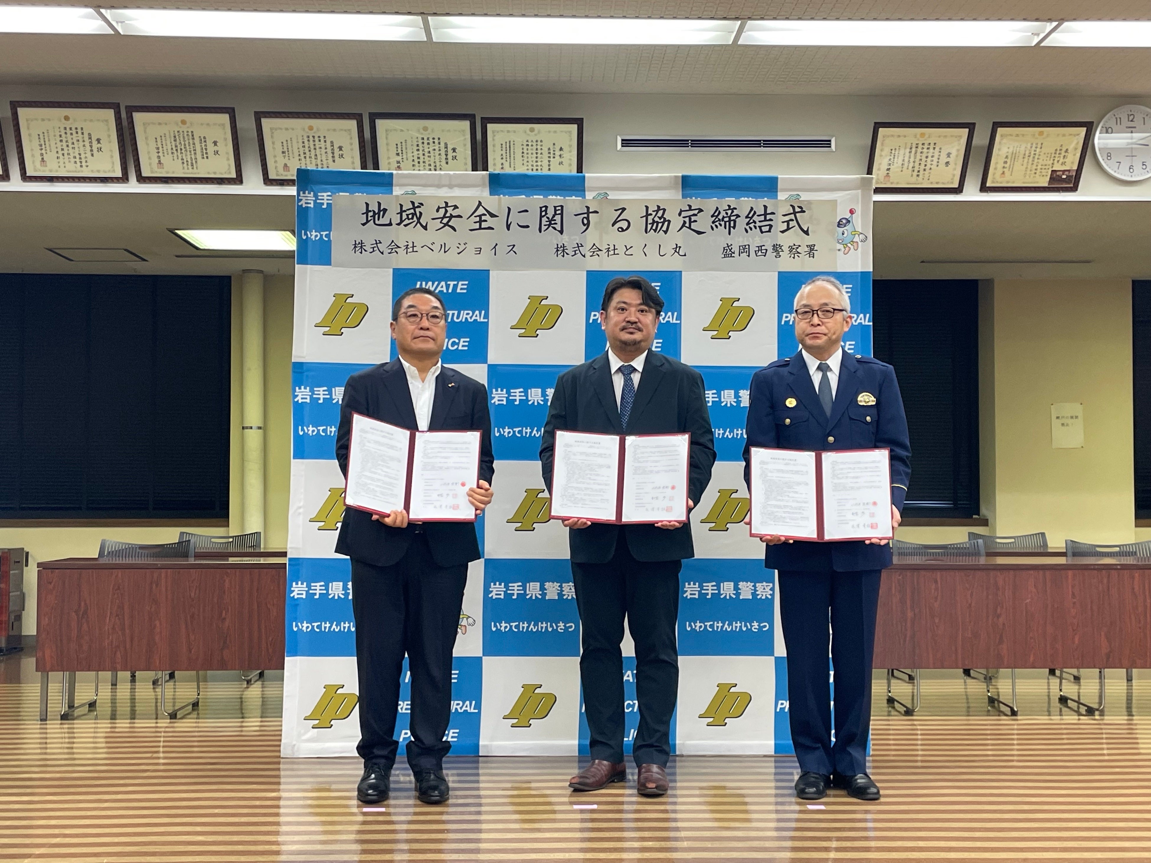 とくし丸の買い物支援と同時に行う地域の「見守り活動」を積極的に進めるため、開業前に盛岡西警察署、ベルジョイス、とくし丸の3者間で「地域安全に関する協定」の締結式を盛岡西警察署で執り行い、盛岡西警察署・署長、永澤氏、ベルジョイス・会長、小苅米氏、販売パートナー・徳山氏、とくし丸・代表の新宮らが出席しました。