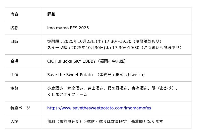 農園芸のイノベーションカンパニー welzo(本社:福岡市博多区、代表取締役社長:金尾佳文)が主導する「Save the Sweet Potato(SSP)」は、10月23日(木)・30日(木)の2日間、地域と未来を“さつまいも”でつなぐフェス 「imo mamo FES 2025」 を CIC Fukuoka SKY LOBBY にて開催します。