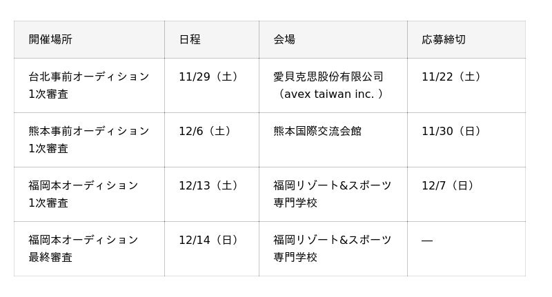 ※熊本・台北事前オーディション通過者は福岡本オーディション1次審査へと進みます。(福岡本オーディション1次審査の一部審査免除)