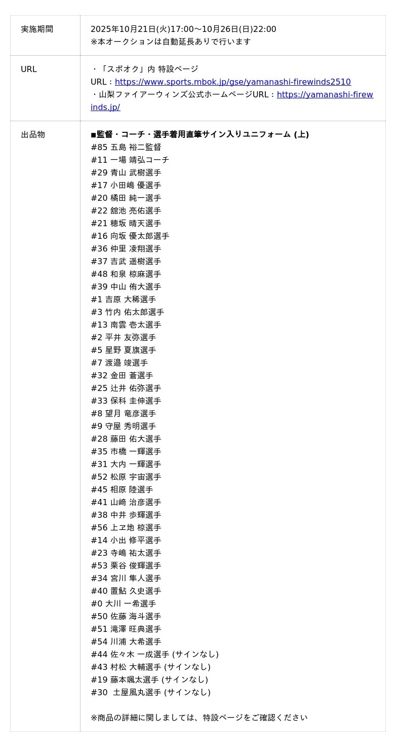 【2025年シーズン 山梨ファイアーウィンズ 選手実着用ユニフォームオークション 概要】