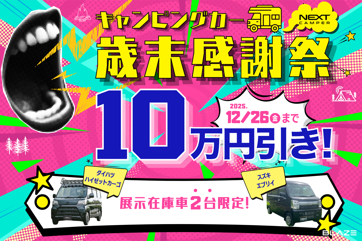 株式会社ブレイズ(愛知県名古屋市、代表取締役:市川秀幸、以下ブレイズ)は、2025年10月22日(水)~12月26日(金)、までの期間、軽キャンピングカーキット「NEXT CAMPER(以下、ネクストキャンパー)」において展示在庫車2台を対象に、通常販売価格から税込10万円引きでご提供いたします。