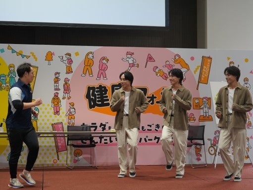 続く体操コーナーでは、日常にも取り入れやすいストレッチやエクササイズを体験。佐藤三兄弟が軽快な動きでリードすると、子どもから大人まで自然と体が動き、笑顔と笑い声が広がるひとときとなりました。