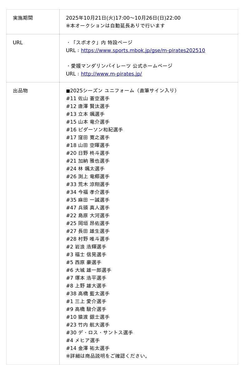 の愛媛マンダリンパイレーツが実施する『愛媛マンダリンパイレーツ 独立リーグ日本一 スペシャルオークション』を2025年10月21日(火)から開始します。