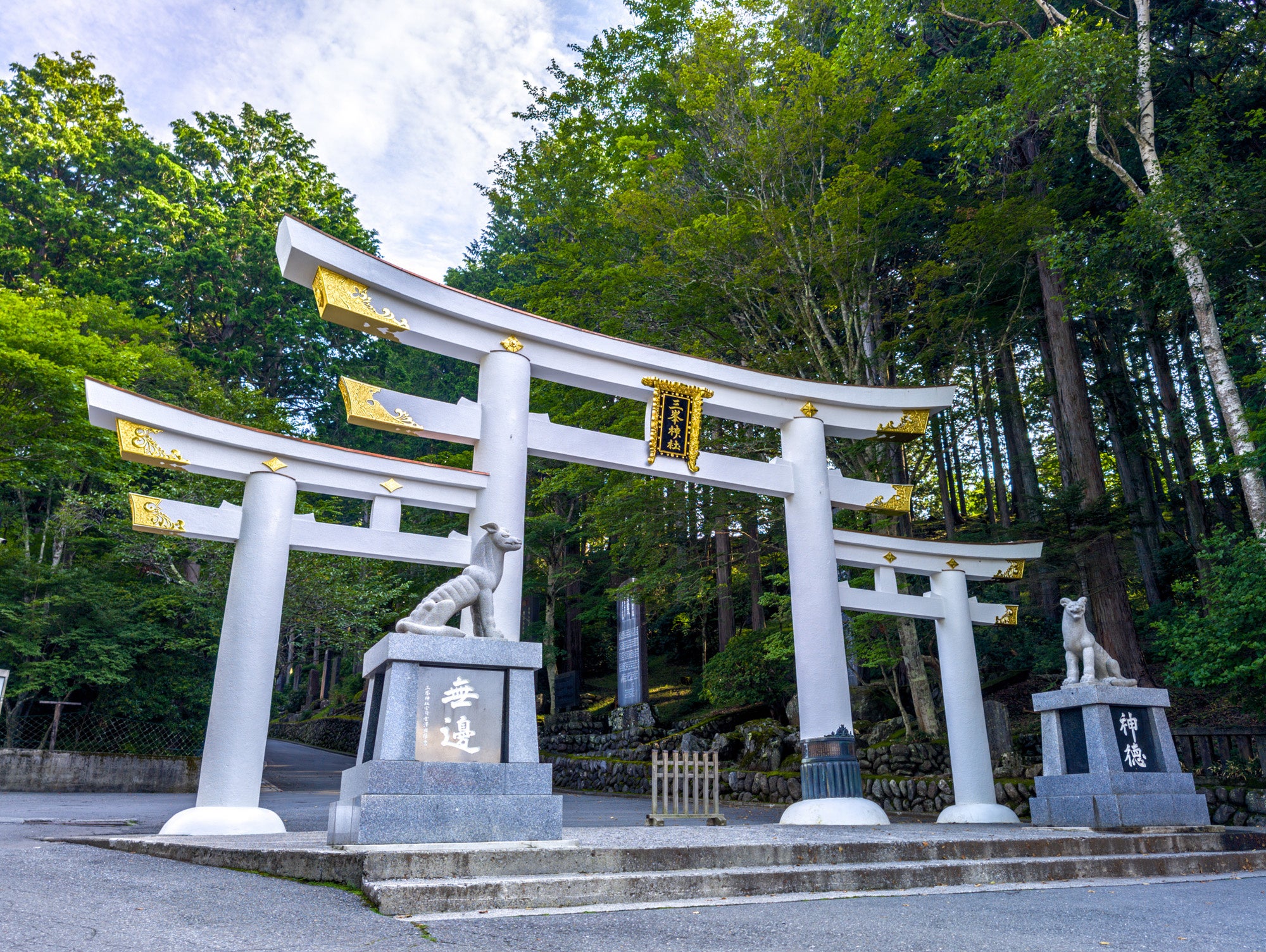 全国的にも珍しい三ツ鳥居。両脇には狛犬ではなくオオカミがお迎えしています。