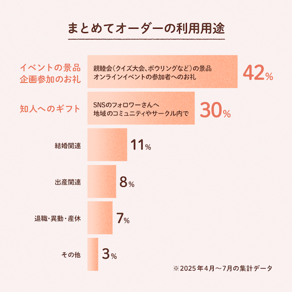 「まとめてオーダー」機能は、内祝、結婚式の引出物、パーティーのお土産、町会・こども会イベント、個人事業主のビジネスシーン利用、オンライン活動者のファンとのコミュニケーションなど、一対複数のギフトシーンに活躍する機能であり、贈る宛先が11件以上の場合にお受けいたします。