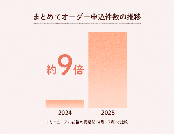 eギフトプラットフォーム事業(※1)を展開する株式会社ギフティ(本社:東京都品川区/代表取締役:太田 睦、鈴木 達哉/以下、ギフティ)は、ギフティが運営するWEBサービスおよびスマートフォン向けのアプリ「giftee(R)」において、個人(※2)のユーザーが大量のギフトを一括で購入できる「まとめてオーダー」に2025年4月より専用フォームを設け、より便利にご利用いただけるようになりました。専用フォームの運用開始後、2025年の4月から7月の「まとめてオーダー」のお申込み件数は、前年同期間の約9倍と大変好調に推移しています。「まとめてオーダー」は、「giftee(R)」のユーザー登録有無にかかわらず皆様にご利用いただける機能であり、ギフトの送付先が複数件ある際に1件1件個別に購入する手間を省き、一括でオーダーいただけます。ギフトに添えるカードデザインも、購入者がご用意された写真やイラストを利用することができ、よりオリジナリティの高いギフトを贈ることができます。なお、2025年9月19日(金)より、特集ページ『gifteeでお菓子を配って、ハロウィンを楽しもう!|11個以上なら「まとめてオーダー」』を公開し、ハロウィンのお菓子配りにぴったりな本機能の活用方法やギフトをご紹介しておりますので、あわせてお知らせいたします。