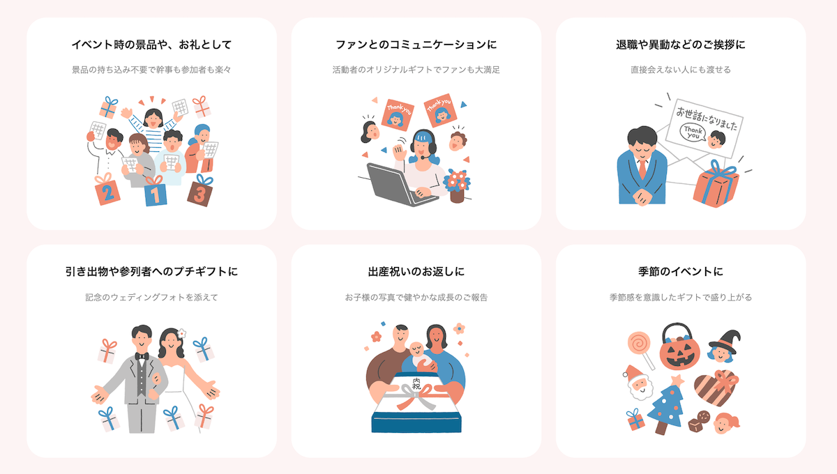 近年、eギフトは、友人や家族等との一対一のコミュニケーションシーンに加え、内祝いや結婚式の引き出物、退職や異動の挨拶、個人事業主のビジネスシーン、イベント幹事から参加者への景品やお礼、クリエイターからファンへのギフトなど、一人の方が複数人にギフトを贈るシーンにおいても活用が広がっております。