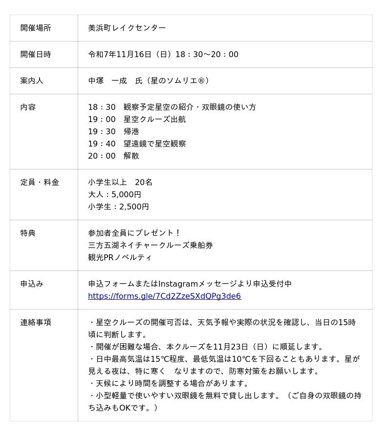 福井県美浜町レイクセンターでは、11月に特別イベント「星空クルーズ」を開催します。