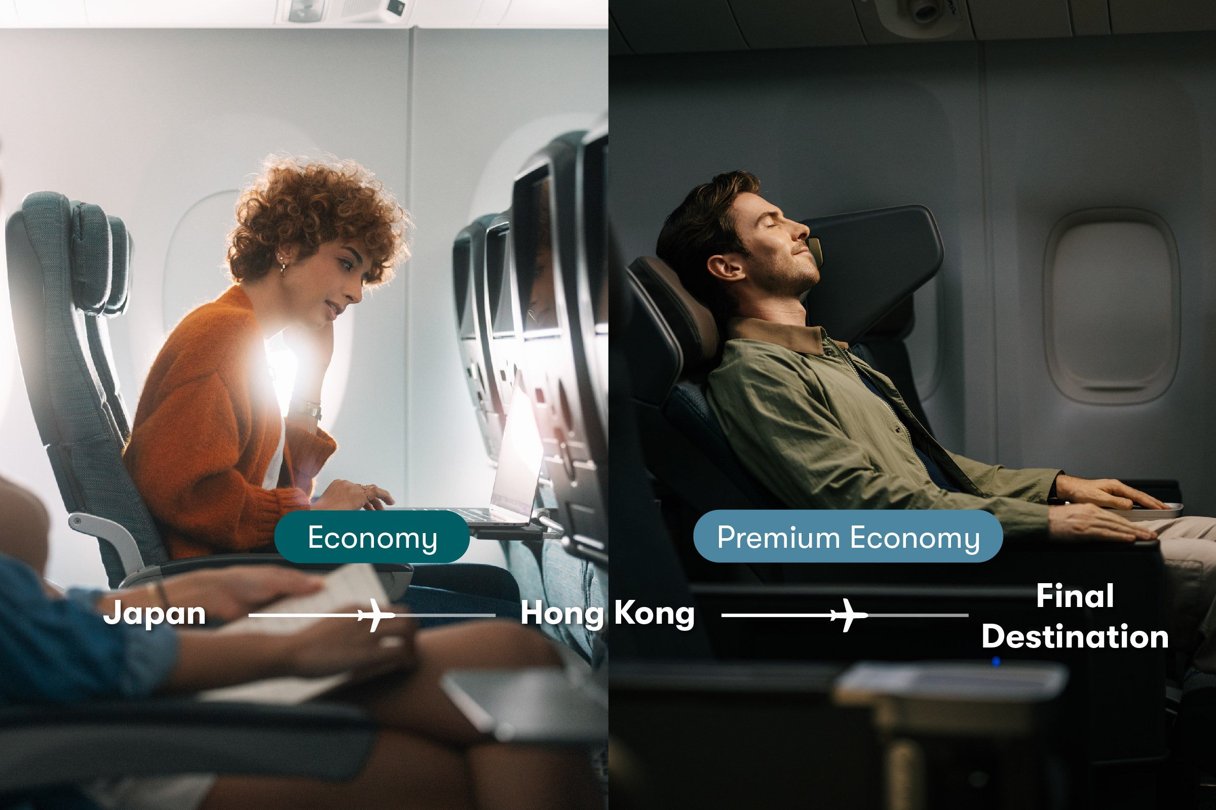 本航空券は、2つの客室クラスを組み合わせ、コストパフォーマンスと快適性を両立した旅を提案するもので、中長距離路線で、日本-香港間はエコノミークラス、香港-最終目的地間はプレミアム・エコノミークラスを利用しワンランク上のくつろぎをご体験いただけます。