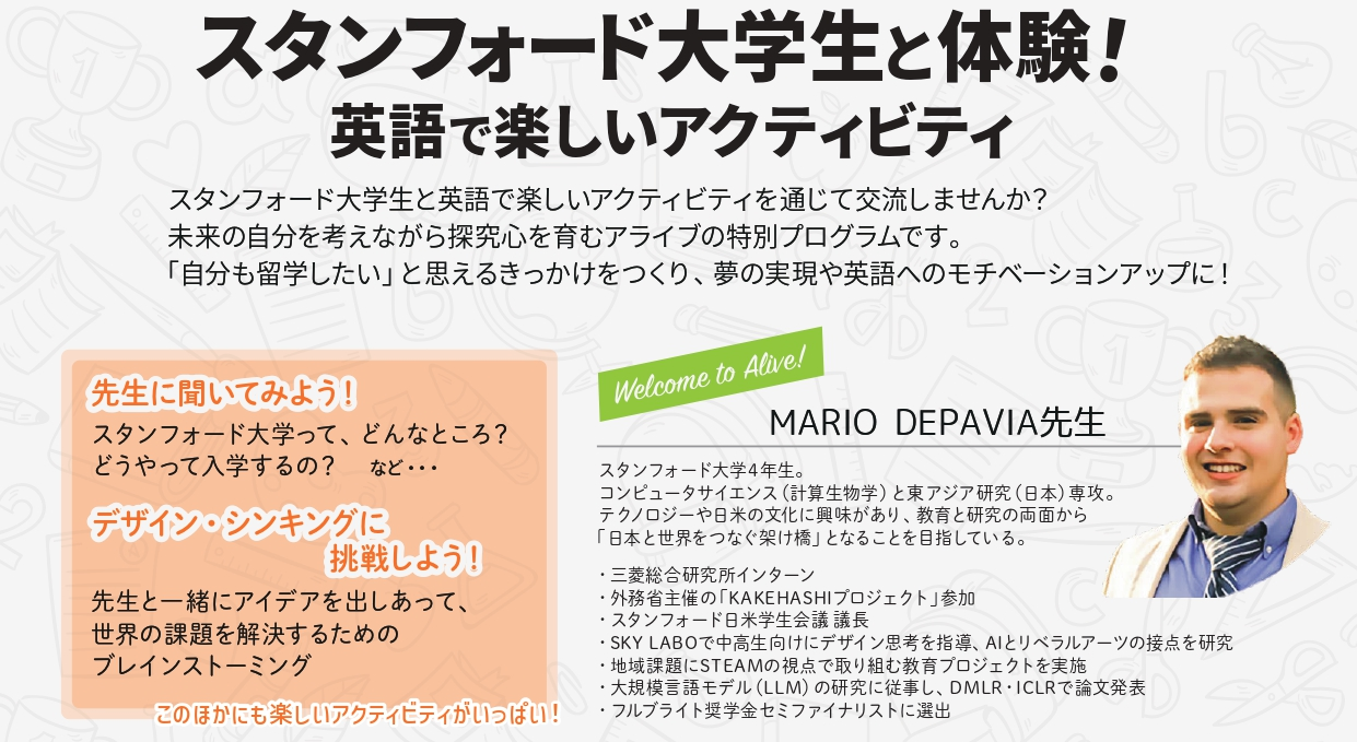株式会社アライブは、「Inspire the world ~教育で、未来に豊かさを~」をミッション、「生きる力、未来を切り拓く力を持つ、"世界のリーダー"の育成」をビジョンに掲げ、子ども向け英会話をはじめ、英語を活用した多彩なレッスンを提供。これまでに、ハーバード大学のリーダーシップチームやシリコンバレーの教育者と連携して、革新的なリーダーシップや起業家育成、SDGs などのプログラムを数多く実施。